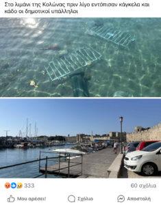 Ένα απίστευτο περιστατικό σημειώθηκε στο λιμάνι της Κολώνας στη Ρόδο. Πιο συγκεκριμένα, δημοτικοί υπάλληλοι εντόπισαν πριν από λίγες ημέρες στο βυθό κάγκελα και κάδο απορριμμάτων, τα οποία φαίνεται να πετάχτηκαν στη θάλασσα από αγνώστους.